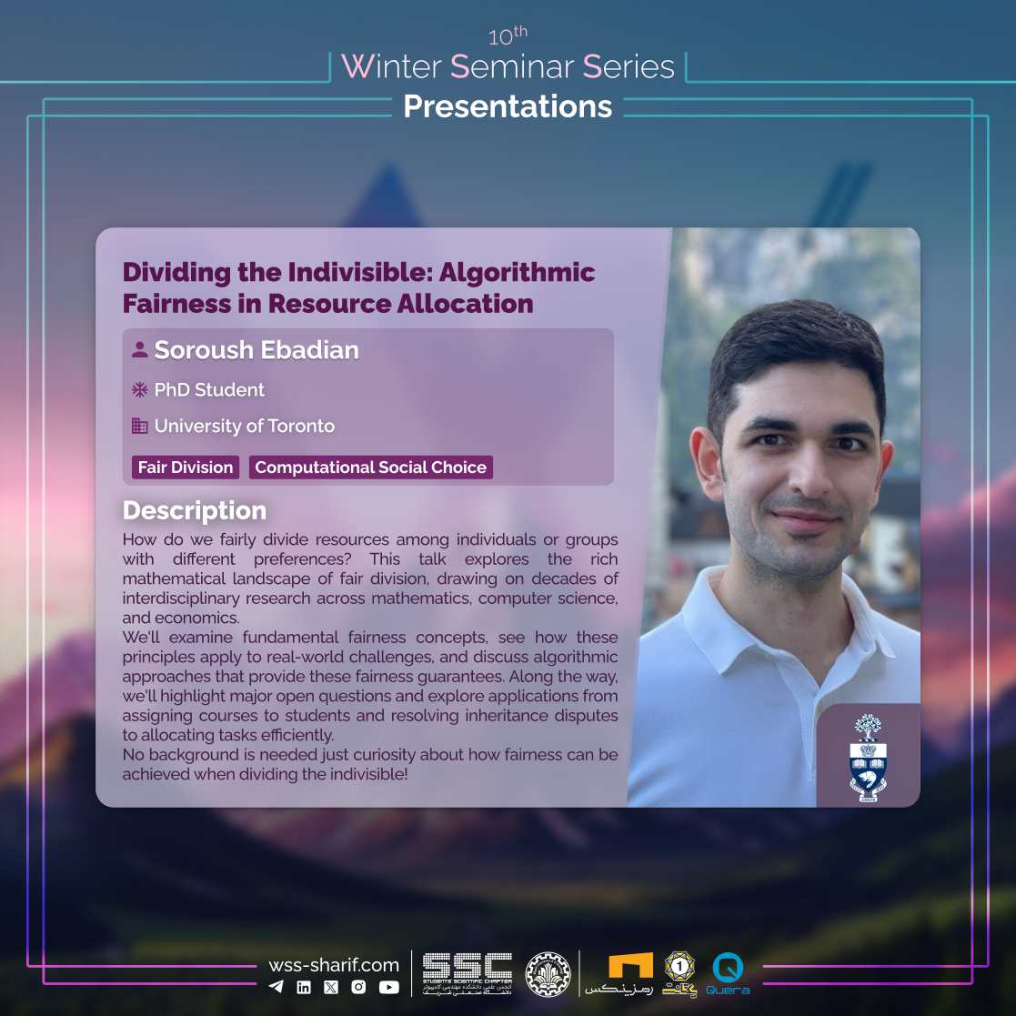 How do we fairly divide resources among individuals or groups with different preferences? This talk explores the rich mathematical landscape of fair division, drawing on decades of interdisciplinary research across mathematics, computer science, and economics. We'll examine fundamental fairness concepts, see how these principles apply to real-world challenges, and discuss algorithmic approaches that provide these fairness guarantees. Along the way, we'll highlight major open questions and explore applications from assigning courses to students and resolving inheritance disputes to allocating tasks efficiently. No background is needed just curiosity about how fairness can be achieved when dividing the indivisible!